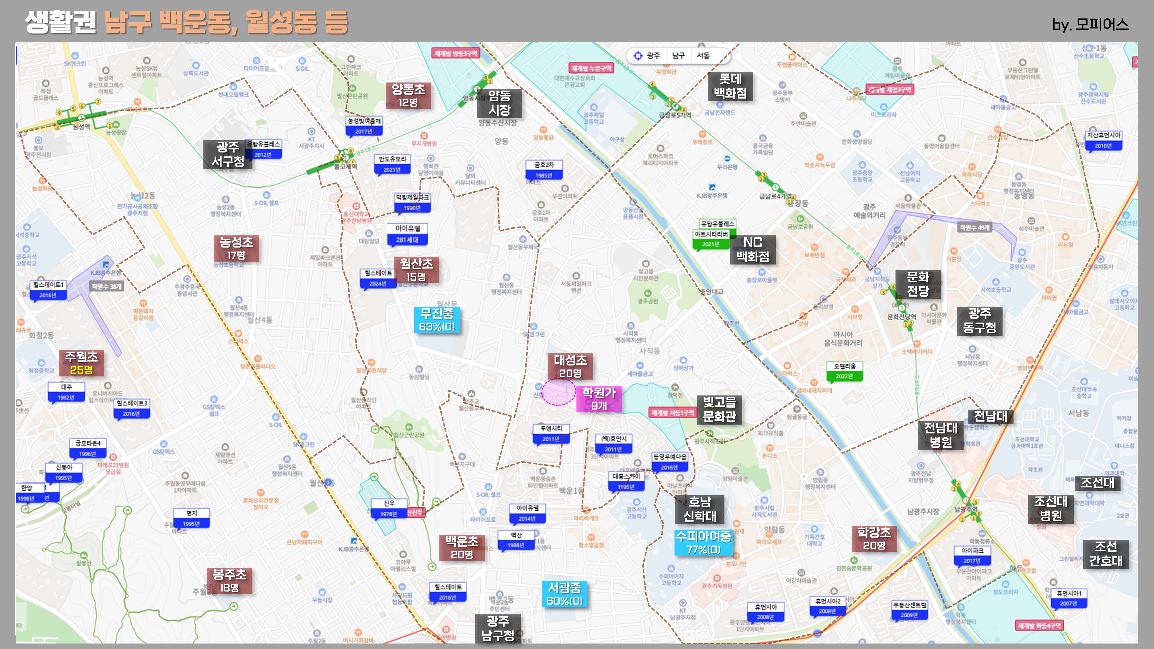 - 갈색박스: 초등학교 배정 범위를 갈색 점선으로 나타내였으며, 초등학교 학급당인원도 넣었습니다.