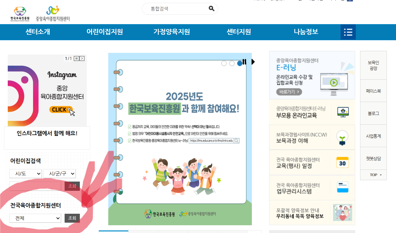2) 왼쪽 맨 아래 [전국육아종합지원센터]에서 거주지역 선택!